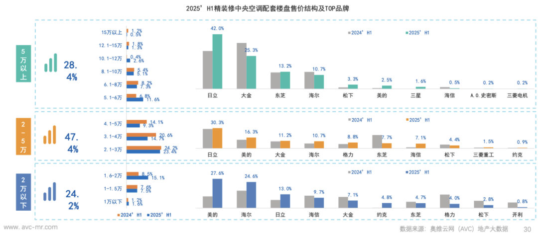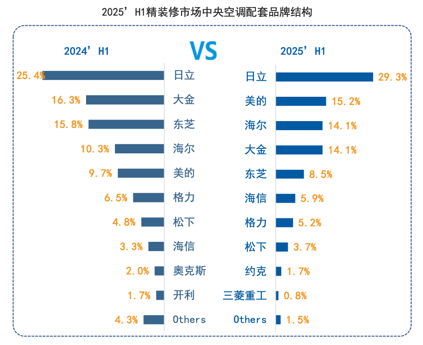 据奥维云网《中国高品质精装住宅系列研究:中央空调篇》(数据来源:奥维云网家居罗盘 5.0)显示,2025年上半年全国精装修市场共配套中央空调326个项目、15.99万套。全国精装修市场中央空调配套TOP5品牌合计占据81.2%的份额,竞争格局高度集中,日立以29.3%的市场份额稳居行业第一,展现了其强劲引领力与市场号召力。